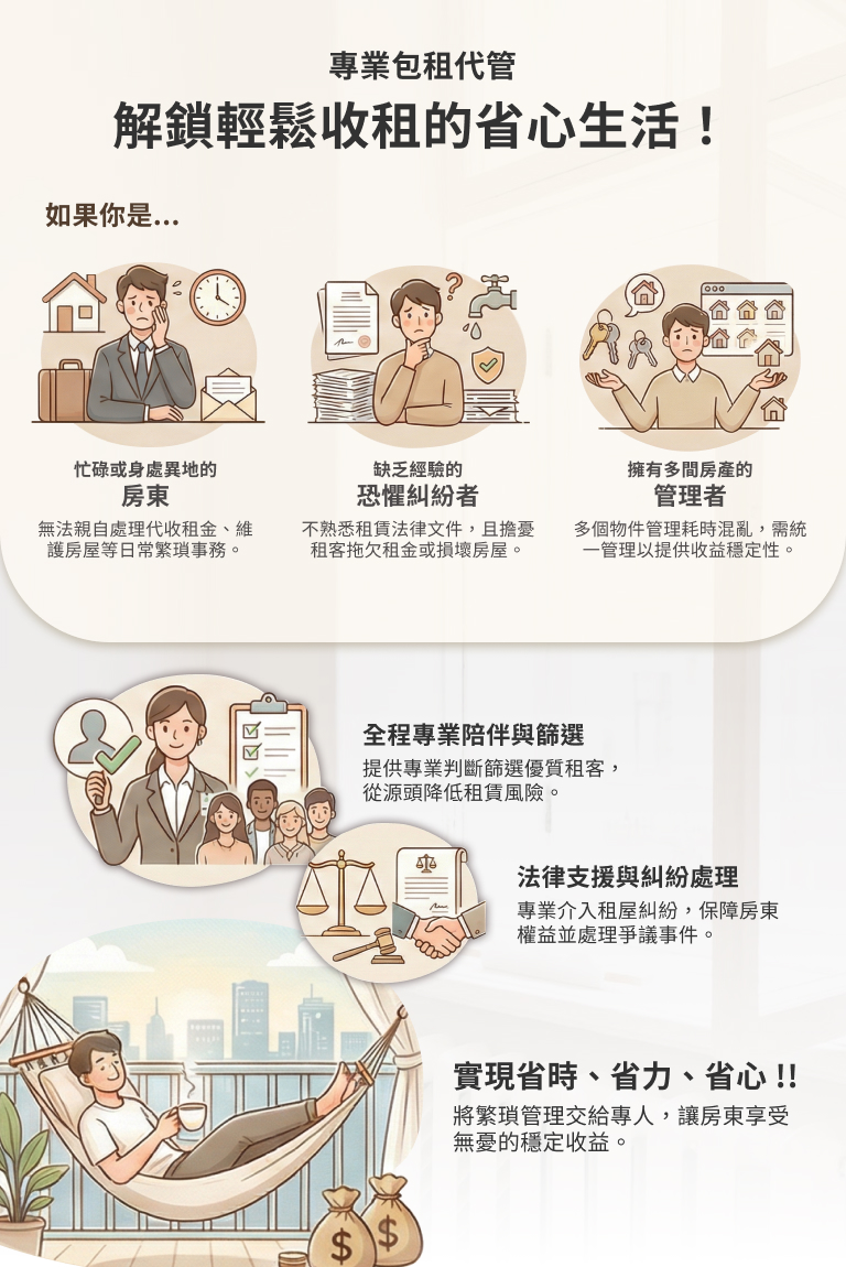 包租代管/代租代管不只是媒介成交,更是全程專人管理房屋,包括 租客篩選、租金收取、房屋維護、輕裝修翻新與糾紛處理,讓房東免操心。